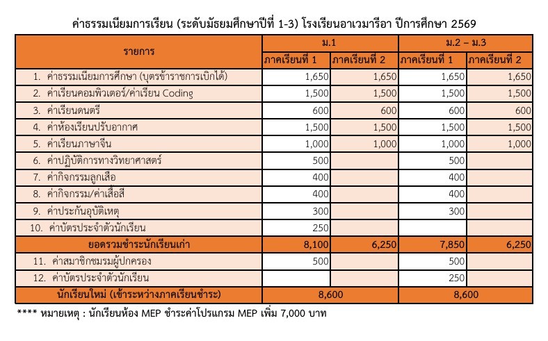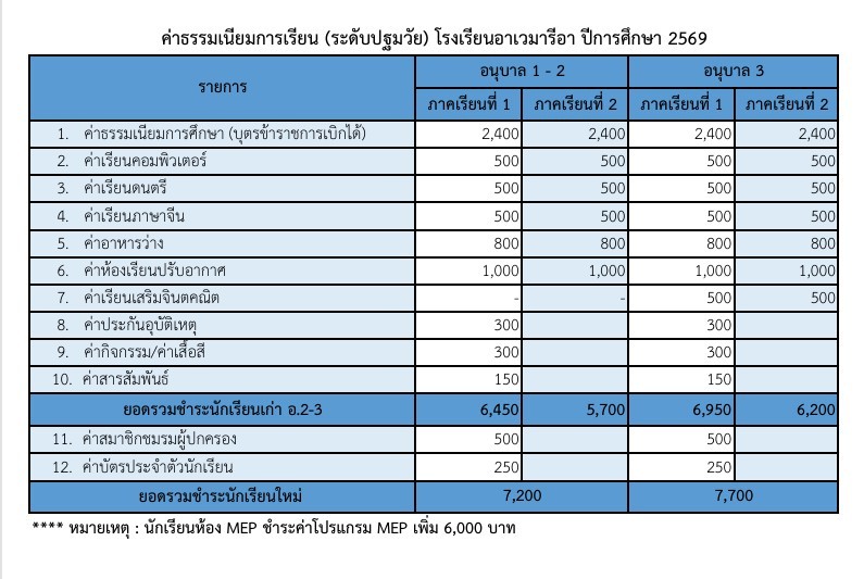 ค่าธรรมเนียมการเรียนปีการศึกษา 2569