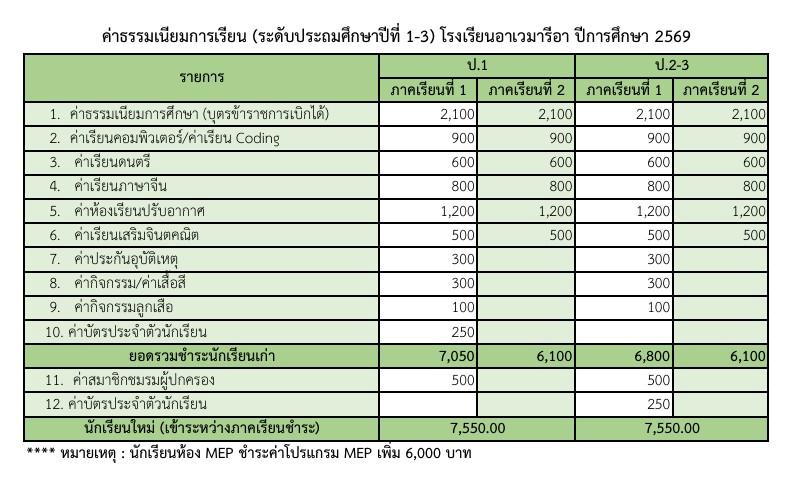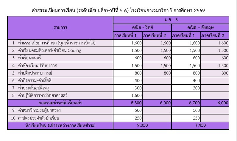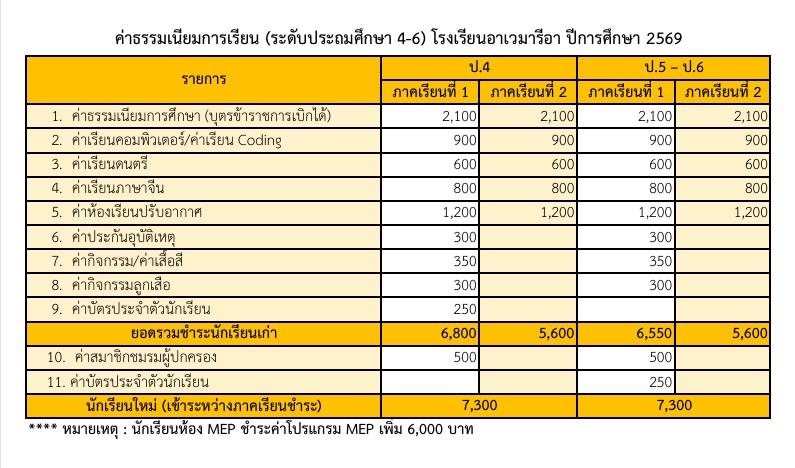 ค่าธรรมเนียมการเรียนปีการศึกษา 2569